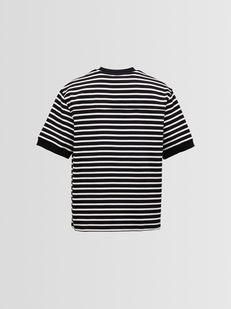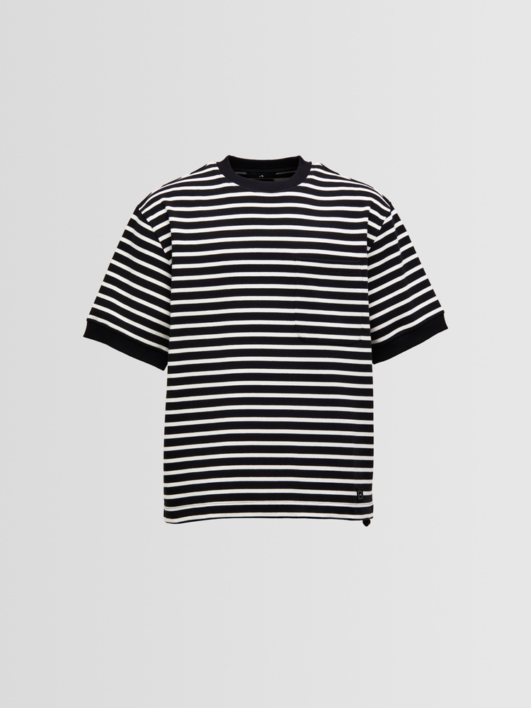 A structured short-sleeve tee crafted from heavy double-knit jersey, offering a clean, substantial feel while staying soft and breathable. Subtle stripe detailing adds depth to the minimalist design, complemented by shaped sleeves, a reflective drawstring, and an adjustable hem for a refined, functional look.